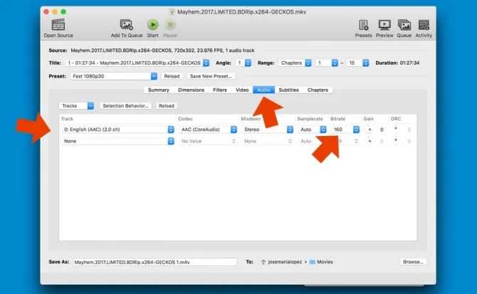 Hay que tener en cuenta que cuantos más canales de audio, más ocupará el archivo convertido. Relacionado con esto, podemos cambiar el códec del audio y/o el valor del bitrate para sacrificar la calidad del audio en pos de un vídeo que ocupe menos espacio.