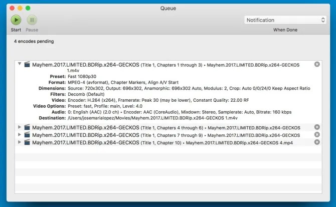 En el vídeo de ejemplo, tenemos 10 capítulos. Creamos una primera tarea para convertir los capítulos 1 a 3, luego otra para los capítulos 4 a 6, otra para los capítulos 7 a 9 y una última para el capítulo 10. Así no nos pasaremos del límite de 2GB.