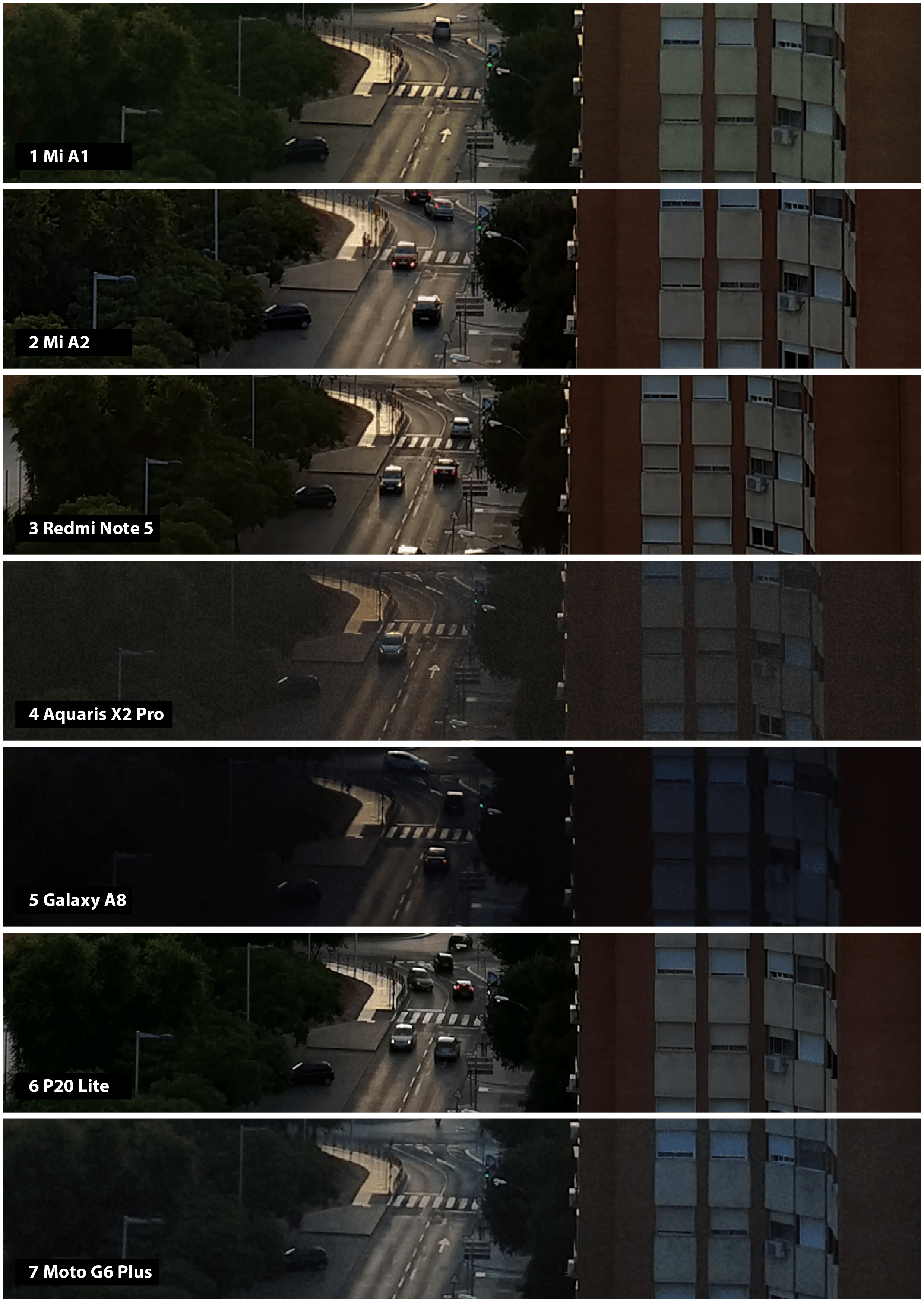 Empezamos por una de las pruebas más exigentes, donde podremos ver cuánto dan de sí los sistemas en los que, hay que recordar, no hay presente ningún estabilizador óptico, por lo que todo depende de apertura, tamaño de sensor, de subir el valor ISO y aplicar fotografía computacional. El orden de aquí en adelante siempre será el mismo: Xiaomi Mi A1, Xiaomi Mi A2, Xiaomi Redmi Note 5, BQ Aquaris X2 Pro, Samsung Galaxy A8, Huawei P20 Lite y Motorola Moto G6 Plus.