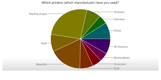 En cuanto al hardware más utilizado, un poco más del 50 por ciento se concentra en la RepRap, Makerbot es el segundo modelo más popular y el tercero es Objet. El resto se distribuye entre Ultimaker, Dimension, Eos, Zcorp y Stratasys entre otras.