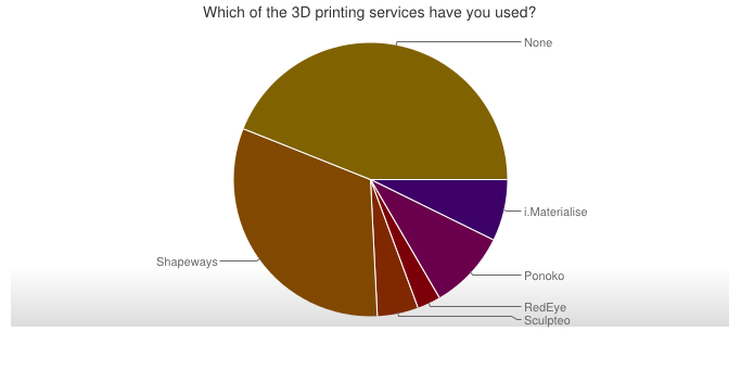 En relación a los servicios de impresión más populares, la encuesta indica que Shapeways y Ponoko son los más usados, aunque de acuerdo a la encuesta una gran mayoría de usuarios simplemente no utiliza servicios de terceros para tresdeimprimir. Hay indicios de que la gente que realiza actividades de fabricación digital, no necesariamente lo hacen de forma profesional, por lo que los usuarios más frecuentes de los servicios son solo aquellos que necesitan mucha calidad de manufactura y en materiales como los que ofrecen estos servicios. (metal, cerámica, cera)