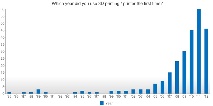 Las tecnologías de impresión 3D no son nuevas, sin embargo, desde hace 5 años el uso de impresoras 3D explotó gracias al desarrollo open-source de nuevos modelos. De acuerdo a la encuesta existen usuarios que utilizaron por primera vez uan impresora 3D hace 27 años, pero en el 2007 su uso aumentó significativamente debido probablemente a que el primer modelo de RepRap fue lanzado en ese año. De acuerdo a la gráfica, 2011 es el año en donde se consolidó la presencia de las impresoras 3D en la escena de fabricación personal.